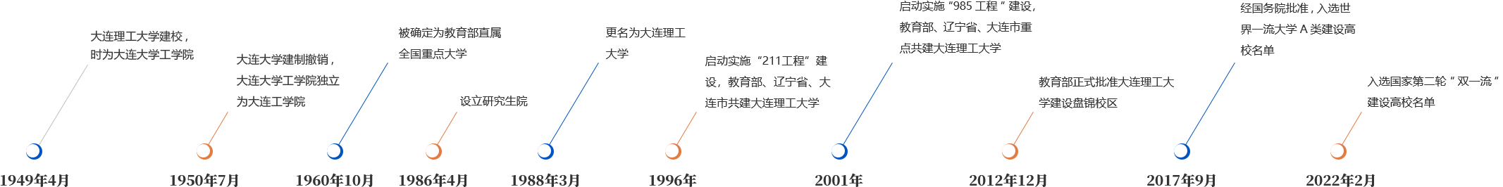 大連理工大學1949年4月建校,時為大連大學工學院;1950年7月大連大學建制撤銷,大連大學工學院獨立為大連工學院;1960年10月被確定為教育部直屬全國重點大學;1986年4月設立研究生院;1988年3月更名為大連理工大學;1996年啟動實施“211工程”建設,教育部、遼寧省、大連市共建大連理工大學;2001年啟動實施“985工程”建設,教育部、遼寧省、大連市重點共建大連理工大學。2012年12月教育部正式批準大連理工大學建設盤錦校區;2017年9月,經國務院批準,入選世界一流大學A類建設高校名單;2022年2月,入選國家第二輪“雙一流”建設高校名單。